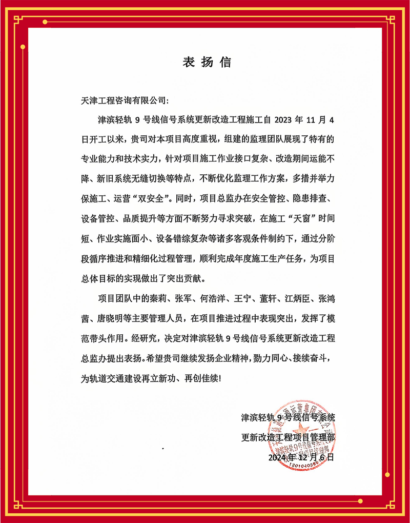 津?yàn)I輕軌9號(hào)線信號(hào)系統(tǒng)更新改造工程項(xiàng)目部感謝監(jiān)理團(tuán)隊(duì)多舉措解決項(xiàng)目施工作業(yè)接口復(fù)雜、改造期間運(yùn)能不降、新舊系統(tǒng)無縫切換等難題,力保施工、運(yùn)營“雙安全”;天津長遠(yuǎn)嘉和置業(yè)有限公司贊賞含璋寶坻項(xiàng)目怡錦園項(xiàng)目監(jiān)理團(tuán)隊(duì)以高度的責(zé)任心、高效的組織協(xié)調(diào)管理和扎實(shí)的專業(yè)技能推動(dòng)項(xiàng)目圓滿完成;天津華勘穂金房地產(chǎn)開發(fā)有限公司感謝監(jiān)理項(xiàng)目部主動(dòng)對(duì)接業(yè)主需求,有效管控質(zhì)量安全,切實(shí)保障施工進(jìn)度,很好地履行監(jiān)理職責(zé)......