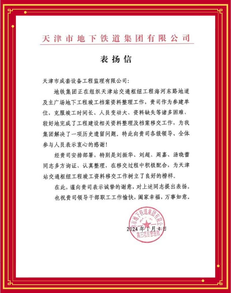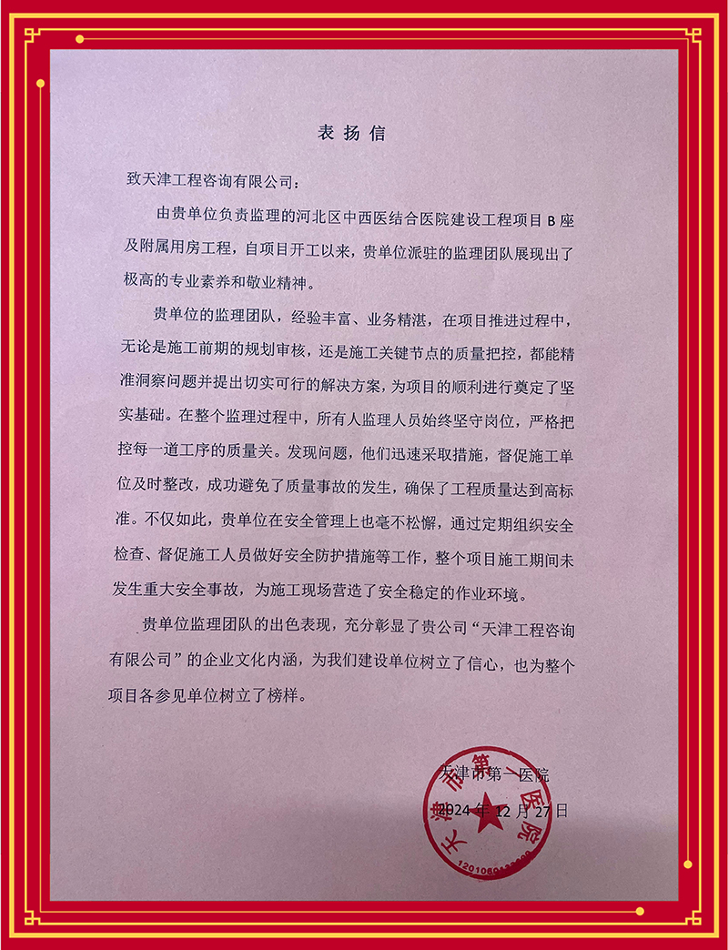 2024年,為持續(xù)深化“1264”戰(zhàn)略體系特別是“六化”舉措,加快推進(jìn)實(shí)體化進(jìn)程,天津咨詢順利完成吸收合并下屬成套監(jiān)理公司,在持續(xù)打造天津咨詢品牌,以工程監(jiān)理和項(xiàng)目管理為基礎(chǔ),發(fā)揮在項(xiàng)目建設(shè)期的綜合專業(yè)優(yōu)勢,逐步形成“監(jiān)”“管”一體化服務(wù)模式方面邁出關(guān)鍵一步。近期,多家業(yè)主單位先后發(fā)來感謝信、表揚(yáng)信,對(duì)天津咨詢承擔(dān)工程建設(shè)監(jiān)理任務(wù)給予充分肯定。