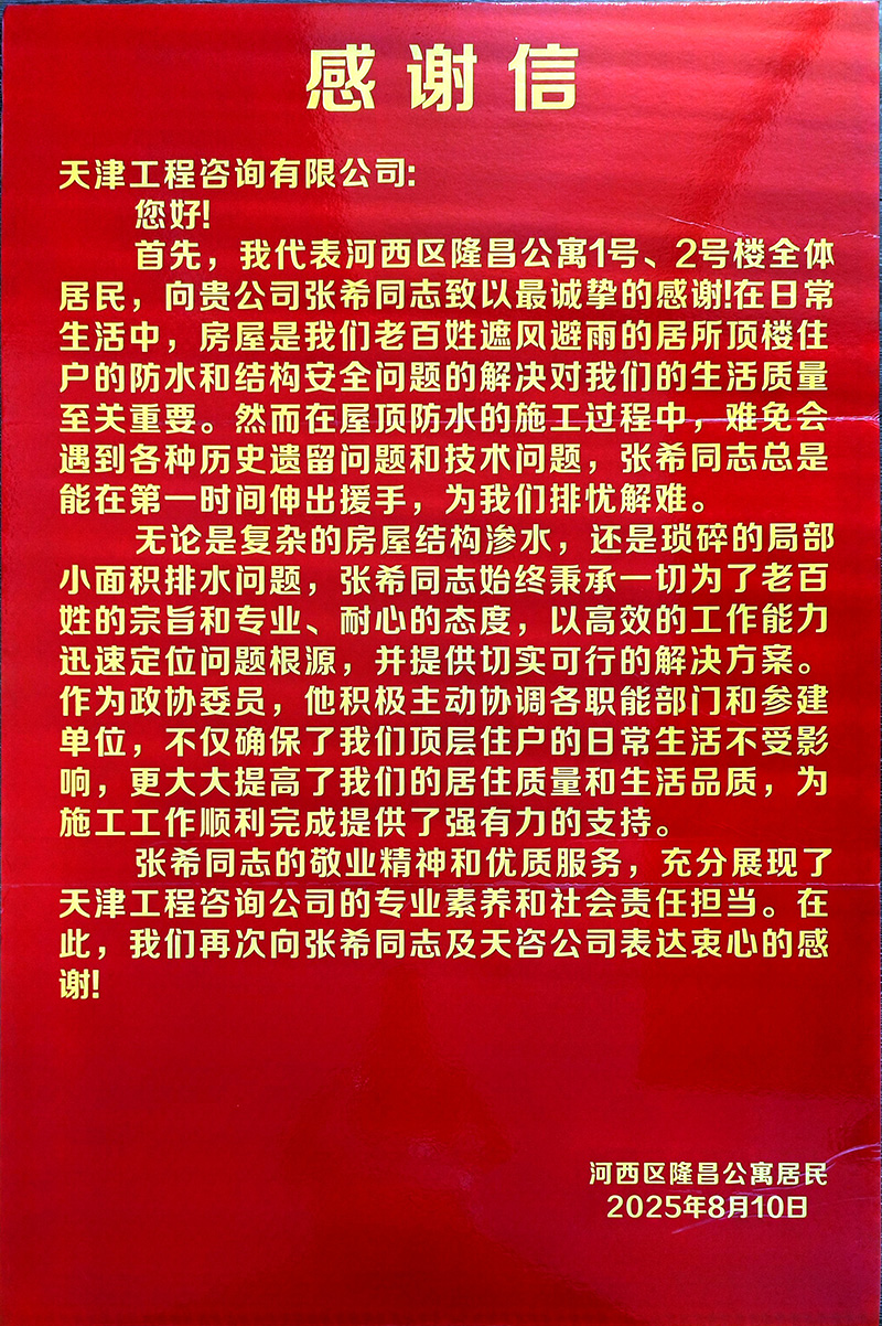 為有效促進工程進展,項目團隊主動加強與居民、街道和社區的多層次溝通。在各小區設立聯絡點,及時公開施工與監理信息,迅速響應居民關切。如隆昌公寓屋面滲水問題,團隊僅用三天便協調解決,展現出高效務實的作風。施工前主動告知計劃,協助居民做好防護,合理安排作業時間避開休息時段,還為年長體弱居民提供搬運幫助。這些細致入微的服務贏得了居民的廣泛贊譽,特地送來感謝信,表揚團隊“專業、耐心、高效”。