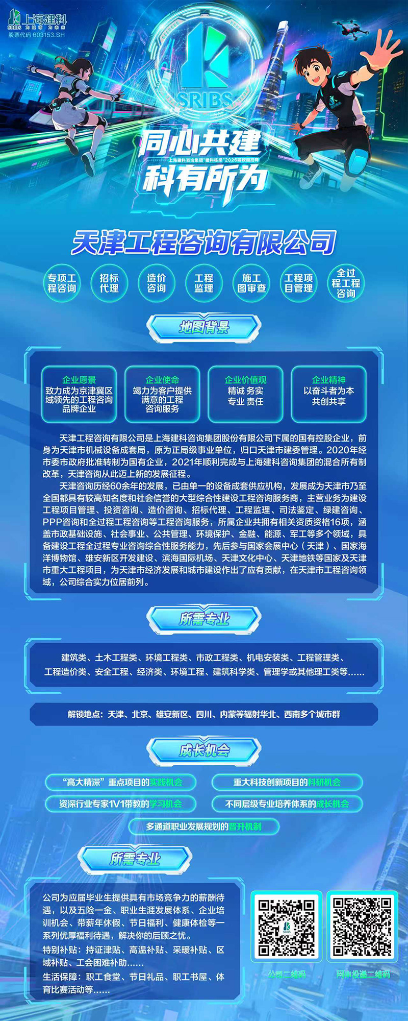同心共建 科有所為天津工程咨詢有限公司啟動2026屆校園招聘 更新時間:2025-10-22 點擊:164 所屬欄目:公司新聞 誠邀2026屆畢業生參加城市專場宣講會(天津大學) 簡歷投遞方式 郵箱:tec_hr@sribs.com 電話:022-88365660 “我與天津咨詢的相遇” 2026屆校園招聘主題vlog